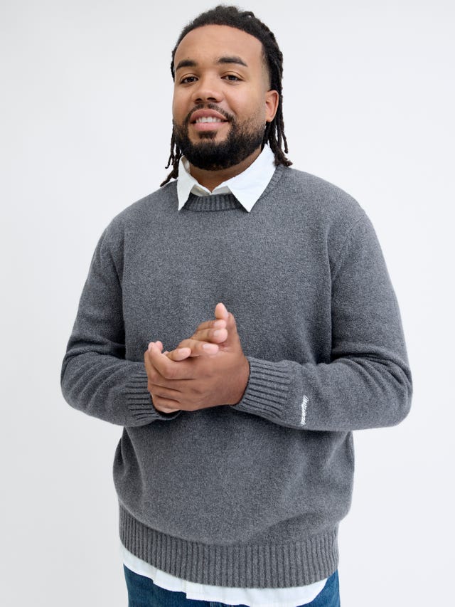 graue, schwarze und rote Plus Size Pullover ohne Struktur, als auch mit Struktur. Aber auch in gestreiften Strickpullovern machst du eine tolle Figur.