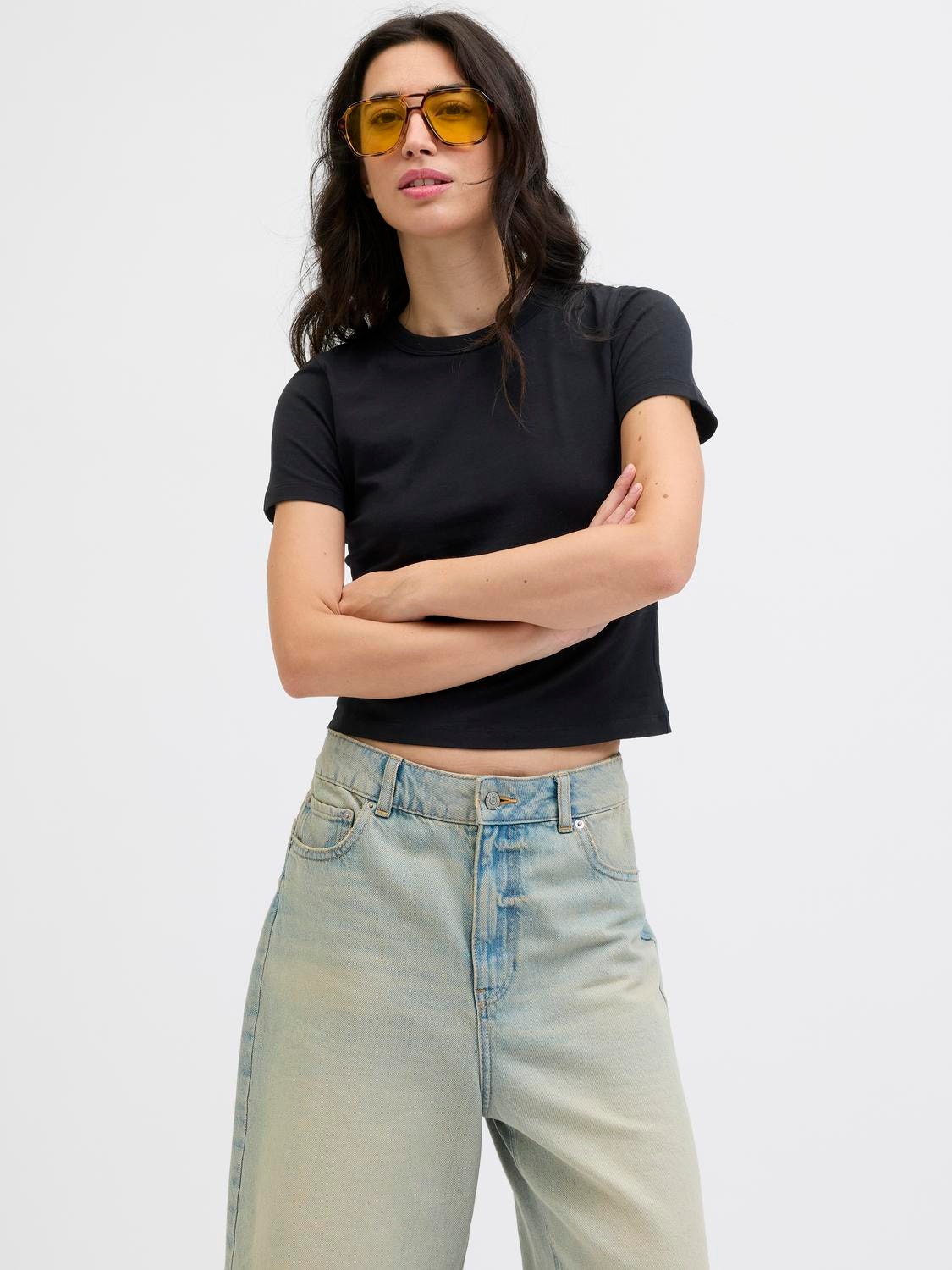 Šie pagrindiniai marškinėliai yra būtinas drabužių spinta, kuri puikiai dera su džinsais, šortais ir kelnėmis.