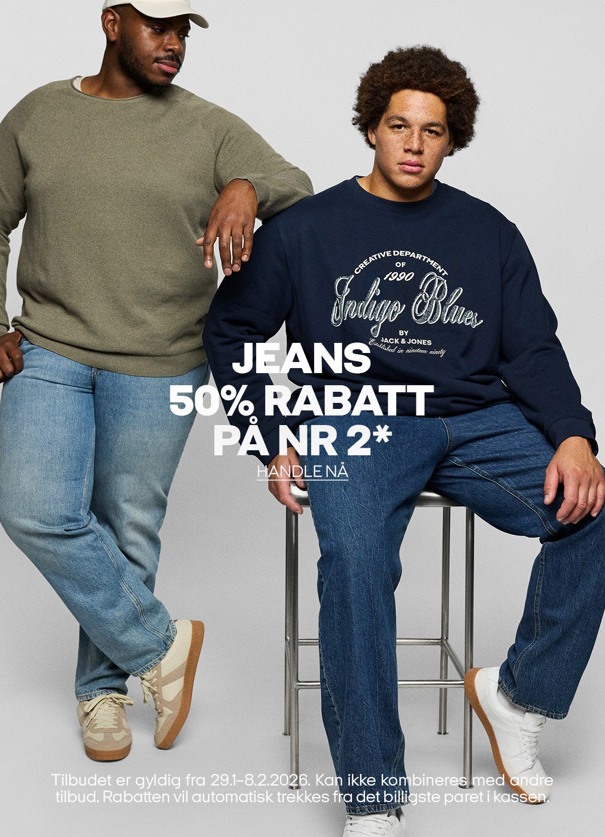 Passform er nøkkelen til enhver styling. Sørg for å finne riktig passform til deg – vårt utvalg av plus size-klær for menn dekker opp til størrelse 8XL og størrelse 54. Moroa begynner når du finner den rette passformen for deg. Lag fungerer alltid, avhengig av sesong – og det gjelder også størrelse small og medium. Vi anbefaler en hvit skorte eller skjorte med print og chinos samt en jakke for en hverdagslook sjefen vil godkjenne og som passer når du skal treffe gutta etter jobb. Og jeans. Du kan bygge nesten enhver look på jeans. Ta på deg pensko og tilbehør, så er du klar for det meste. Bruk boots eller sneakers og en hvit T-skjorte for en hverdagslook som aldri feiler.