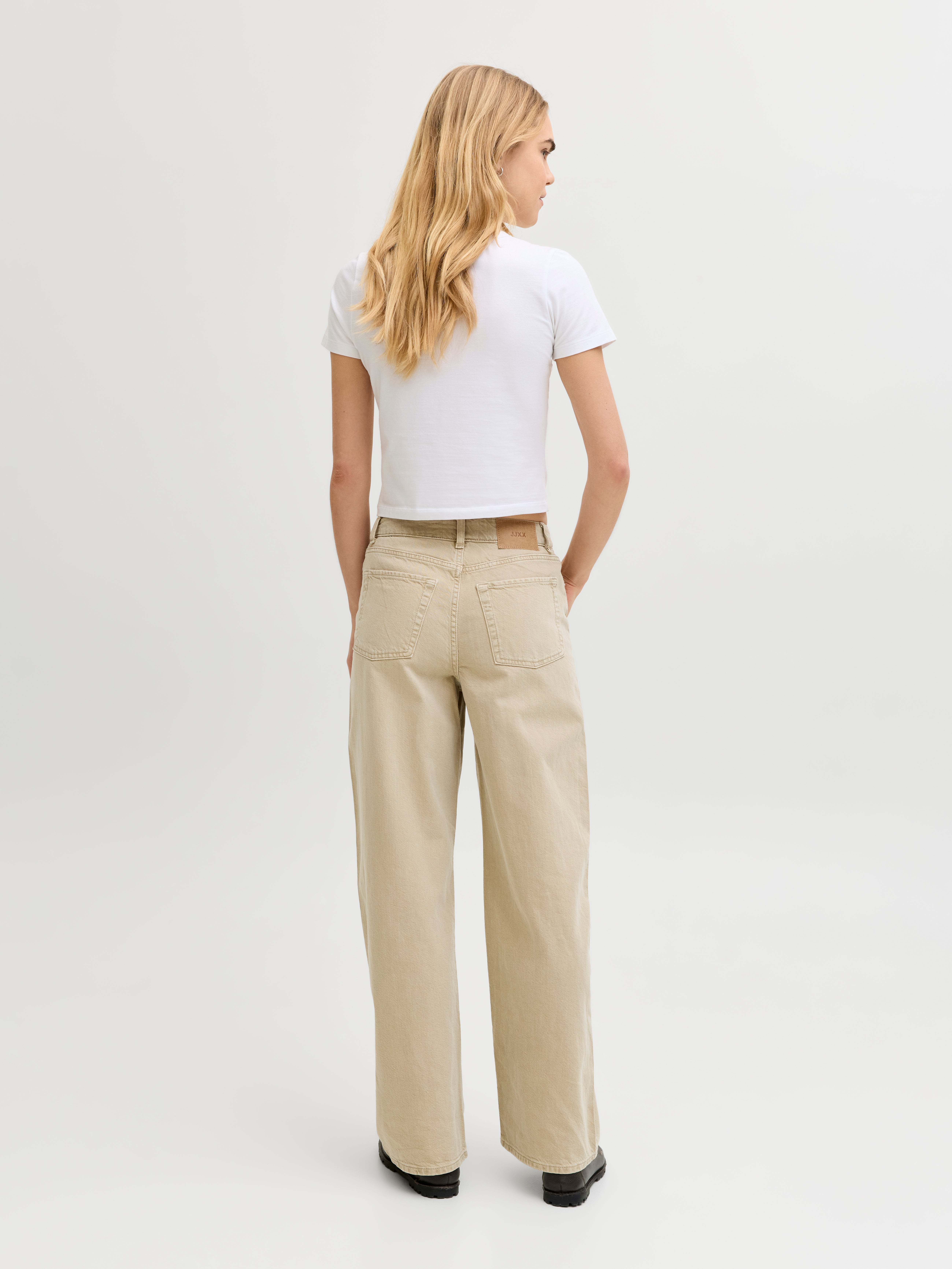- Krój : Wysoki stan, luźny krój, szerokie nogawki