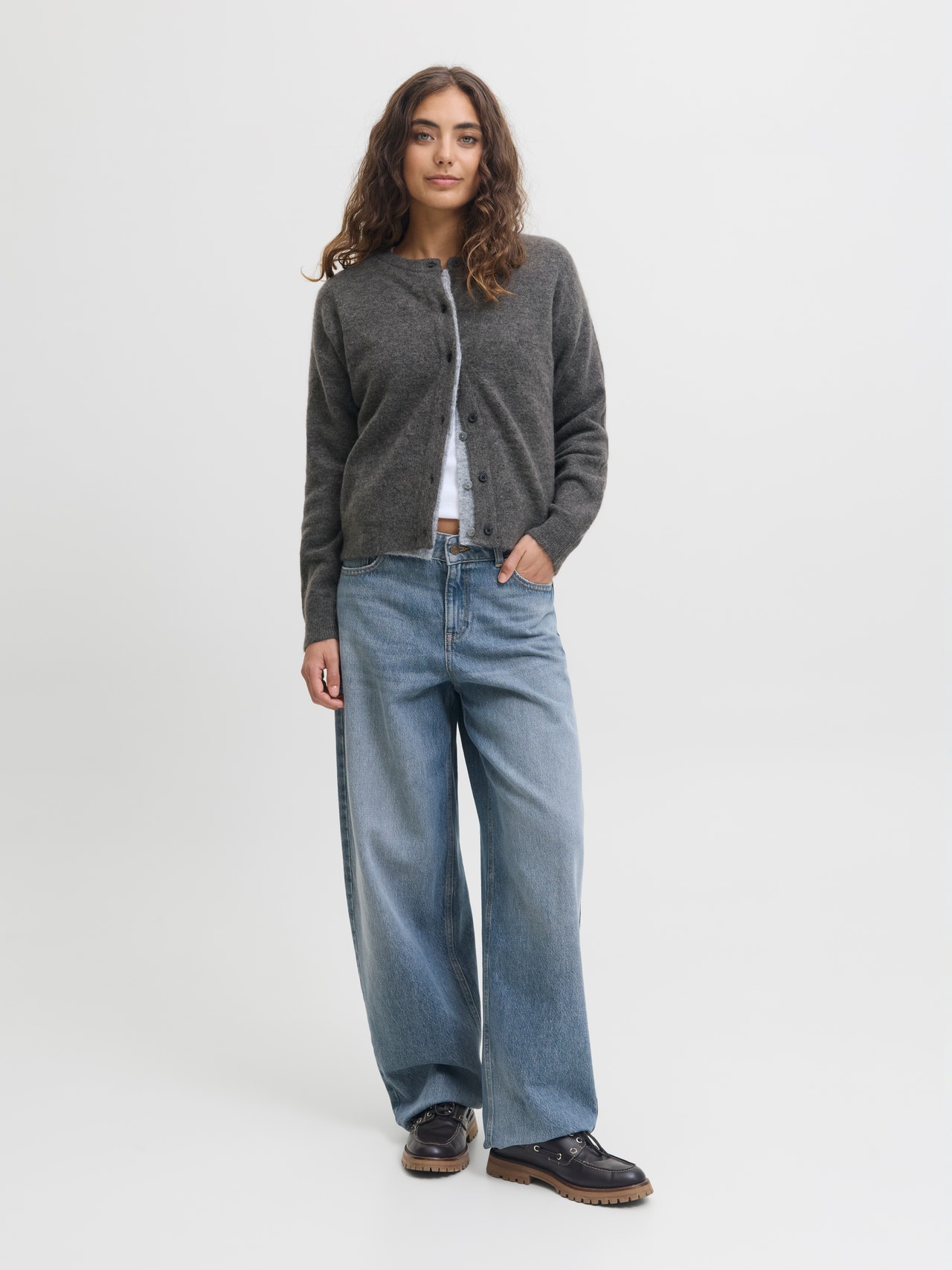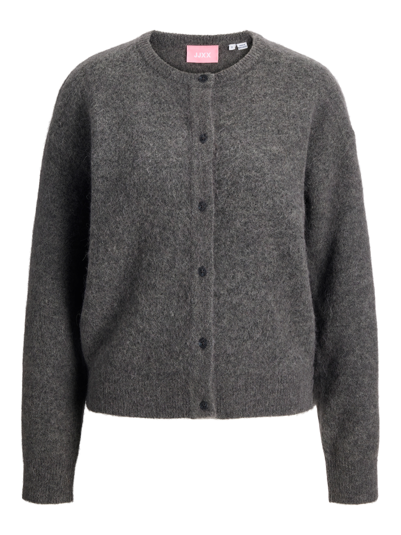 This basic knit goes with everything in your wardrobe. Flat knit is a knitted fabric with comfort and flexibility. - Product Type : Cardigan - Neck : Crew neck - Sleeve : Long sleeves - Cuffs : Ribbed cuffs - Closing : Button fastening - Fit : Loose Fit
